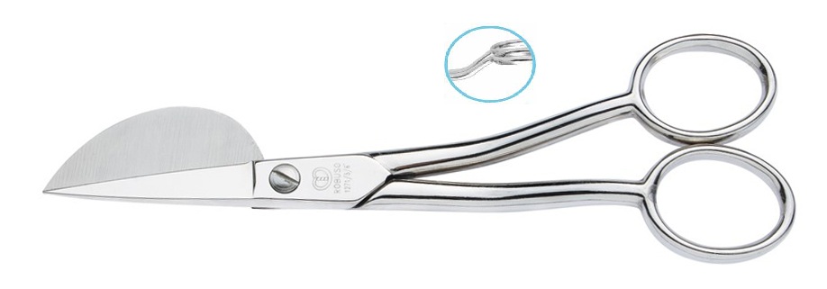Eén snijblad is smal en puntig, één zijde heeft een breed blad voor het opvangen van het geknipte materiaal, geheel vernikkeld en binnenkant van de bladen hol geslepen.Eén snijblad is smal en puntig, één zijde heeft een breed blad.